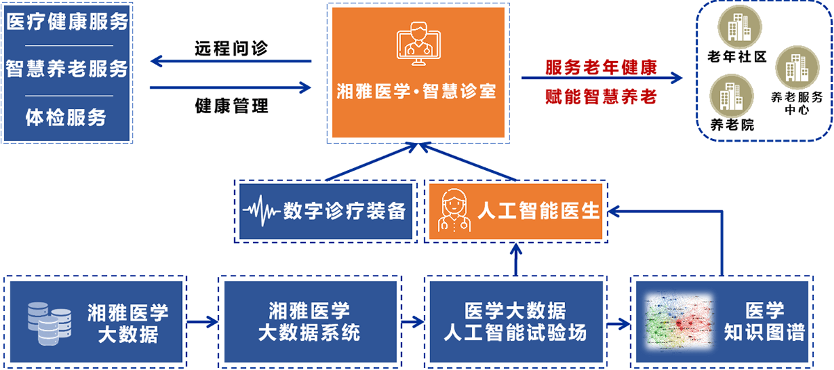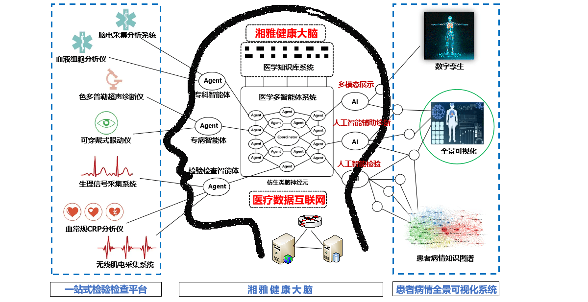 围绕AI医生辅助诊断能力,构建智慧医疗工作站,通过医疗数据互联网连接各级医疗机构,建立电子病历、临床与病理、检验等多类型多模态大规模医学数据的对象化建模与存储机制,开发标准化的疾病队列数据库;建立高效的量化索引与并行计算方法,突破大规模多模态数据的实时计算技术瓶颈;建设高并行自适应的“AI医生大脑”计算技术体系,支撑多智能体自主进化学习和人机融合辩论计算;构建多类型多模态医学知识库系统,建立复杂疾病跨学科知识推理与解释机制;创建医学多智能体辩论计算和谈判技术体系,研制会学习、善交流、能辩论的人工智能医生,为湘雅医学智慧诊室提供面向辅助诊断的AI医生大脑。